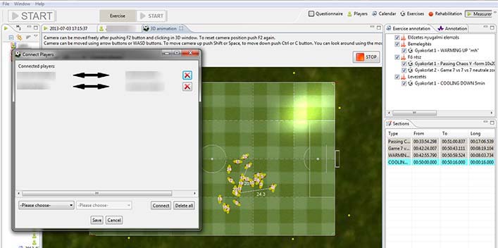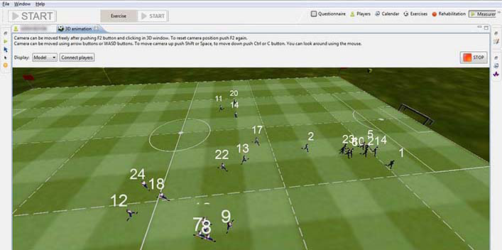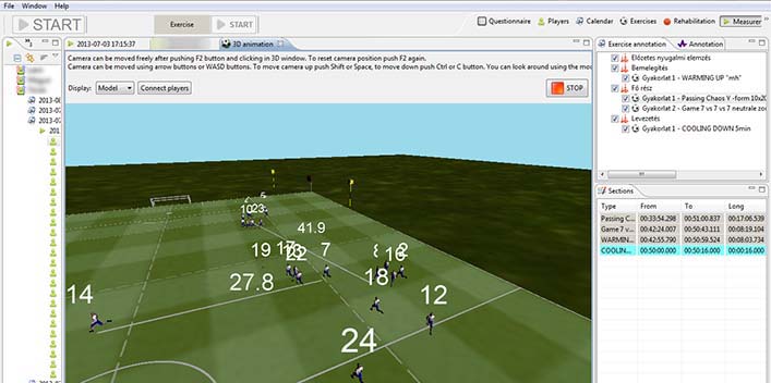 With the help of the animation module the movement of players and their techniques may be monitored and also played back in 3D format after the trainings, making it possible to analyze the whole process of the training, the movements of the players, their performance and the various performance indicators and physiological characteristics attributed to each player. The system measures the distance of players from each other.